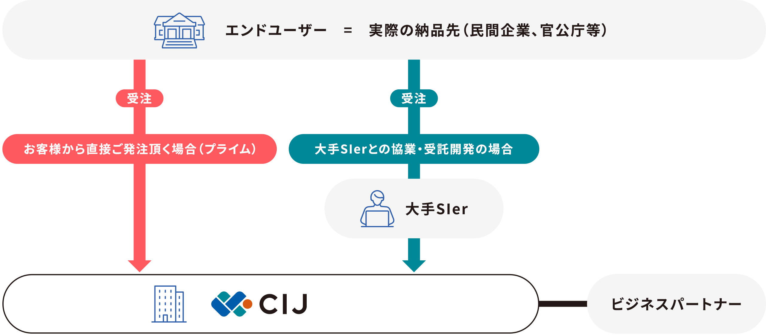 CIJがお客様とお仕事を始める流れには大きく2つの形があります。ひとつは民間企業や官公庁から直接ご依頼をいただくケース、もうひとつは大手SIerを通じてお仕事につながるケースです。私たちは国内有数の大手企業と長年にわたり信頼関係を築いてきました。その背景には『責任をもってやりきる』『品質にこだわる』『誠実に対応する』という姿勢があります。