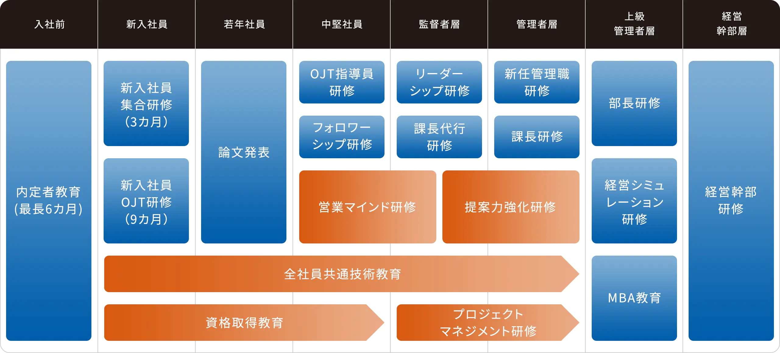 内定者から経営層まで、キャリアステージに応じた体系的な育成を行い、中長期的な視点で社員を成長させます。